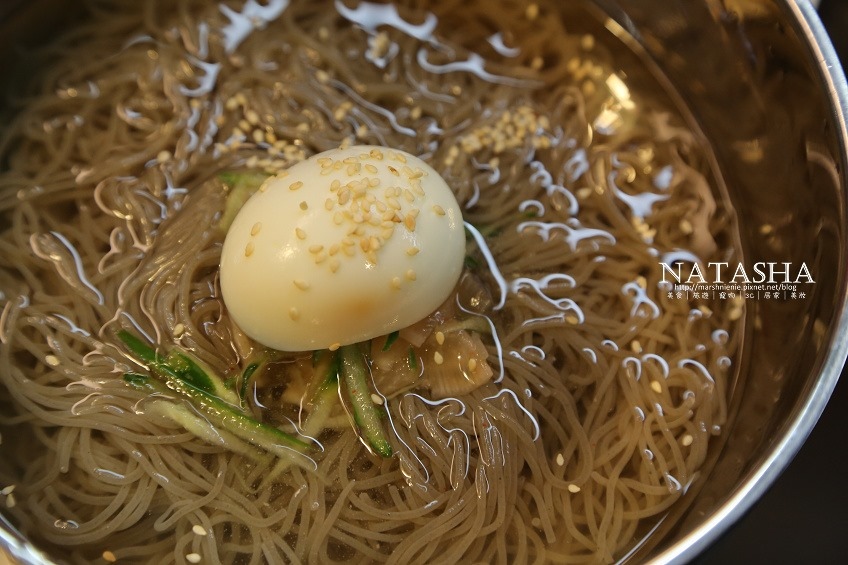 這道韓式冷麵所使用的麵條看起來有點像較細的蕎麥麵,但吃起來不太一樣,比較容易咬斷且Q彈,