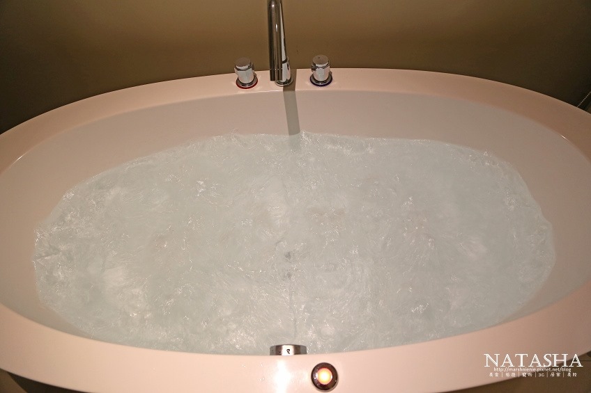 按摩浴缸泡起來非常舒服,窗外還有枯枝落葉造景,因應四季會做不同的變化,