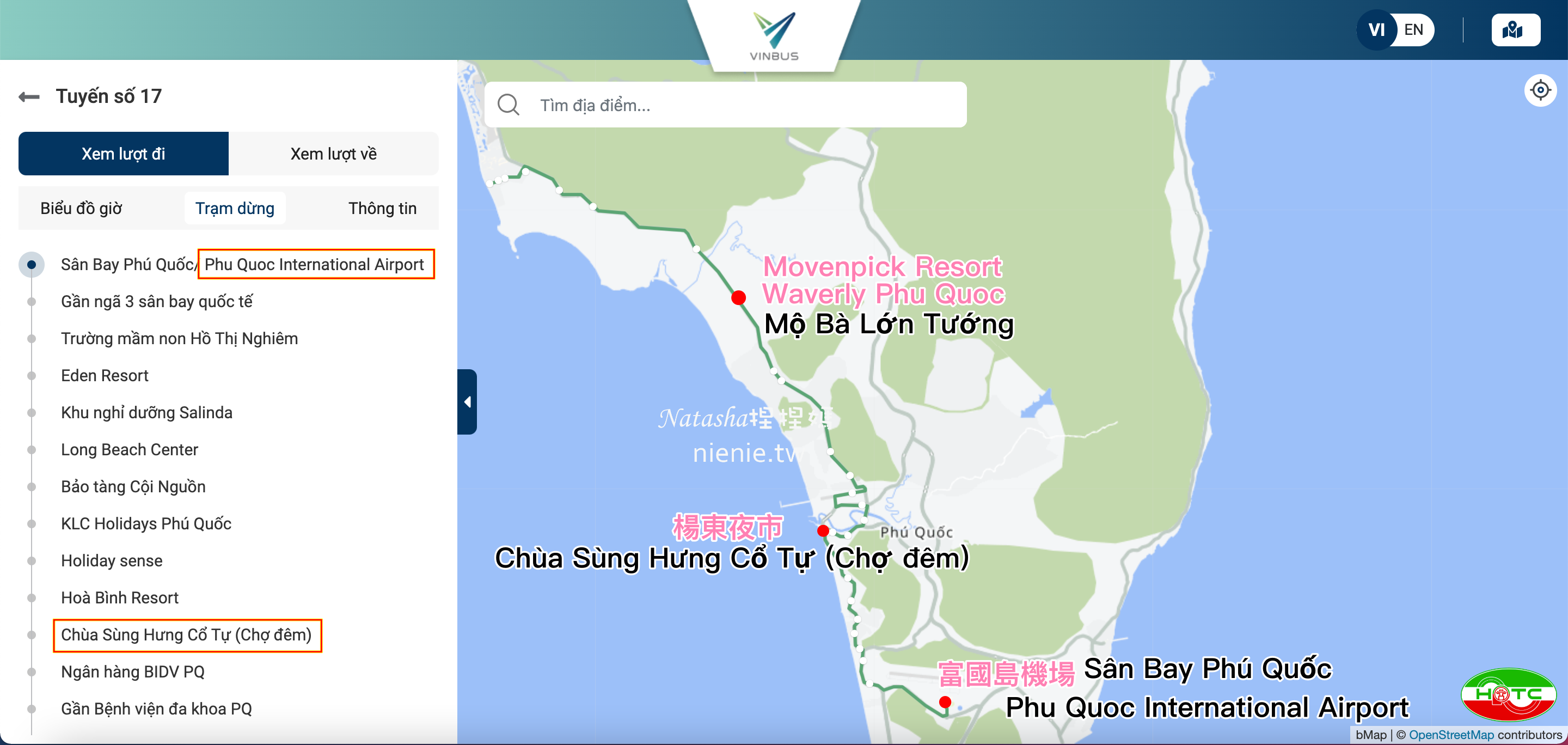 富國島大眾交通運輸以珍珠集團經營的免費巴士 VINBUS 及市區公車為主,入住「Mövenpick Resort Waverly Phu Quoc」若沒有預約到飯店機場接送,也可選擇於機場可搭乘免費公車 VinBus Route 17 抵達飯店,亦可搭乘此免費公車從飯店前往富國島最大夜市楊東夜市。