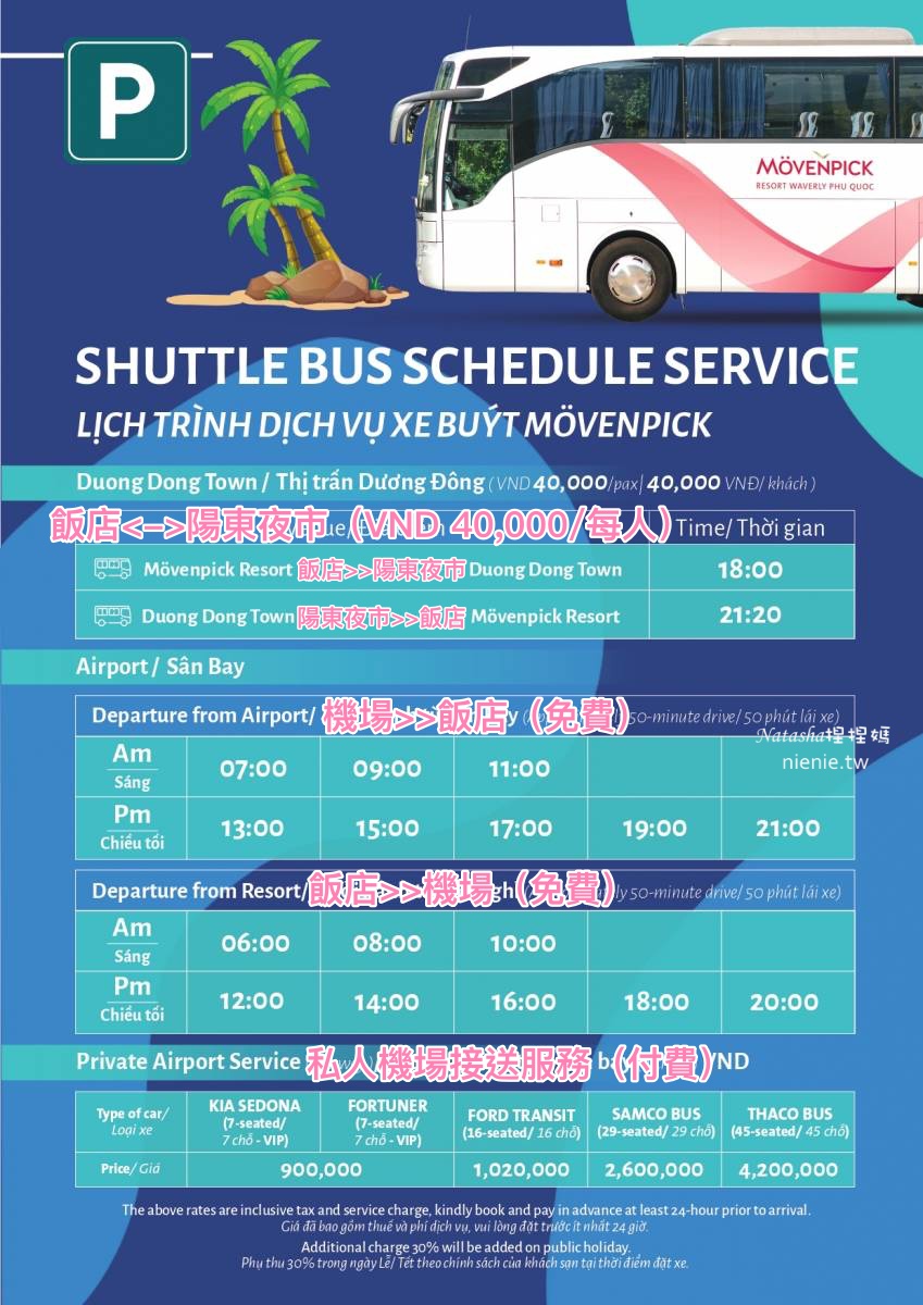 入住「Mövenpick Resort Waverly Phu Quoc」記得善用他們的接駁巴士服務,不僅提供免費機場接送,也能選擇付費 VND 40,000 搭乘接駁巴士前往楊東夜市,記得提前預約。